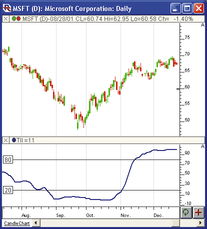 Figure 9: Investor/RT, sample chart. This Investor/RT chart illustrates the trend intensity index in the lower window pane with reference lines drawn at 20 and 80. The preferences seen in Figure 8 were used to construct this TII line.The trend intensity index has also been added to the Investor/RT Rtl Language, and assigned the token name TII. Rtl can be used to compose scans, custom indicators, backtest trading signals, annotations, and e-mail alerts. Pee states that a TII above 50 signals an uptrend, while a TII below 50 signals a downtrend. To scan for instruments that have just crossed from downtrending territory into uptrending territory, use the following syntax: