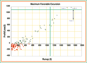 The maximum favorable excursion (MFE) and maximum adverse excursion (MAE) methods were developed by John Sweeney in several articles published in Technical Analysis of STOCKS & COMMODITIES. They are based on plotting a scatterplot diagram showing each trade's final profit or loss versus its maximum runup (for MFE) or drawdown (for MAE). Runup and drawdown are defined as maximum unrealized profit and loss during each trade.