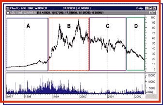 Figure 1: DAILY AOL PRICE AND VOLUME. Price volatility is less before June 1998. For indicators that use price volatility such as StochRSI, you want to use fewer periods in the calculation to generate trading signals than you would prior to June 1998.