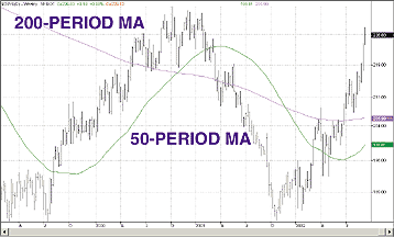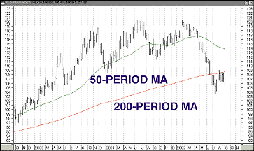 The bull market in the 10-year Treasury has probably been the most significant bull market since 2000. Trading above its 200-day moving average in late 2000, the 10-year Treasury advanced strongly until autumn 2001, when prices briefly slipped beneath their 50-day moving average. Although the 10-year Treasury again struggled in early 2002, by summer the 10-year Treasury by all accounts had regained its bullish ways.