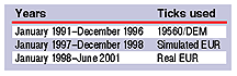 We used historical tick-by-tick data from the exchange rate of the euro (EUR) (the US dollar expressed in euros) in this study. Data prior to the euro's introduction on January 1, 1999, was computed from the Deutschemark expressed in US dollars (DEM) and other European currencies (see Figure 1).