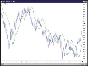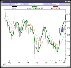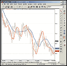 Figure 3: TRADESTATION, MOVING TREND. Here's a sample TradeStation chart demonstrating TradeStation's time series forecast indicator, which can be used to replicate the technique described by William Rafter to create a nonlagging smoothing filter. The time series forecast indicator is plotted along with a moving average. The 20-bar average is shown in light blue; the time series forecast indicator is in red.-- Mark MillsGO BACK