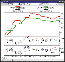 You will notice that the ACC indicator is calculated for every bar of the trading strategy and includes all previous positions and the current open position in its calculation. Because of NeuroShell Trader's unique ability to have multiple trading systems on a single chart, it is very easy to use this statistic to compare multiple trading strategies. To do so, create an ACC indicator for each of the trading strategies that you have on a chart and compare the resulting performance measures. A sample chart is in Figure 11.