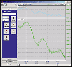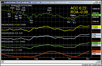 Figure 4 shows the four indicators and the two performance measures (reported in the chart's upper right-hand corner). The trading strategy used was a simple crossover scheme of the OHLC (open-high-low-close) and a smoothed OHLC.