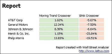 A sample Wall Street Analyzer report is in Figure 17. It shows the results of a moving trend crossover system versus a simple moving average crossover system.