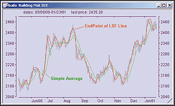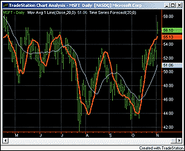 Figure 3 replicates Rafter's Microsoft chart using this time series forecast indicator. The 20-bar average is shown in light blue. The time series forecast indicator is in red.