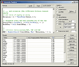 Figure 2: AMIBROKER, NONPARAMETRIC PERFORMANCE MEASURE. Here are sample results of an exploration over a group of symbols. The rightmost column displays calculated ACC values of the sample ADX system for each stock from the basket.
