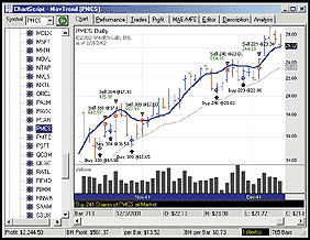 Figure 6: Wealth-Lab, MOVING TREND. As you can see from this chart of PMCS, William Rafter's strategy can yield many profitable trades.