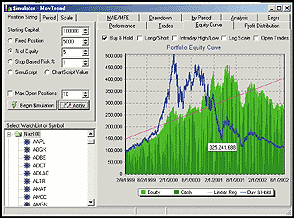 Figure 7: Wealth-Lab, MOVING TREND. This Wealth-Lab chart shows a portfolio equity curve trading the system on the Nasdaq 100 stocks. The equity curve follows the rise of the overall bull market, but continues to rise after the Nasdaq 100 (blue line) peaks and starts to decline.
