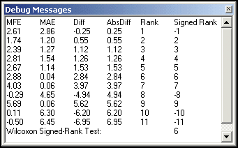 Whenever a trading system position is closed, an instance of the Object is created and stored in a list. When the system completes processing, the list is sorted by Abs( Difference ), after which the rank and signed rank fields are assigned values. The Wilcoxon signed-rank test is computed by summing the signed ranks. The script also prints the contents of the Objects to the Debug Window for detailed analysis (Figure 9).