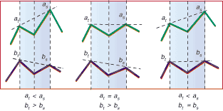 Figure 1 illustrates the divergence of two indicators a and b at a market top. Indicator a creates two tops at and as at times t and s, and indicator b creates two corresponding tops bt and bs. There are three scenarios: indicator a moves higher while indicator b moves lower, indicator a remains flat while indicator b moves lower, or indicator a moves higher while indicator b remains flat.