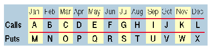 FIGURE 1: OPTION SYMBOLS. Calls and puts are given symbols according to their expiration month.