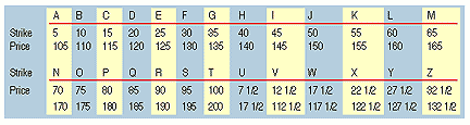 The last letter of the option symbol designates the strike price of the contract. The letter A starts at the 5 strike, B is 10, and so on in intervals of 5 until 100. Then it starts over. At that point, if the stock has symbols for both $5 and $105 strikes, the last letter remains the same, while the root symbol will change. For symbols with 1/2 strikes (71/2, 121/2, and so on), the symbols are different as well (see Figure 2).