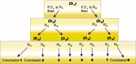 Each branch leads to another node containing a new data statement, at which point another pair of if-then rules causes one of the branches to be chosen, leading to another node containing new data, and so on until the chosen paths terminate in a conclusion. Note each path is a self-contained logic statement. For example, reading down the far left side of the tree in Figure 1 produces the logic statement if D1 is R1 and D2 is R3 and D3 is R5 then conclusion 1.