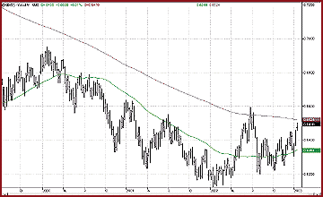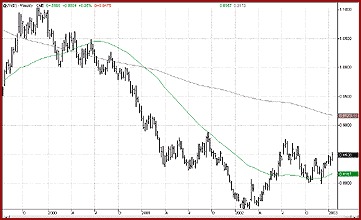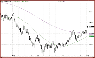 Relative to the US dollar, the Australian dollar has been in a long-term, secular bear market. However, there were signs of a reversal in spring 2001 with the Australian dollar trading as low as $0.45 USD. Since that time, the aussie has moved up more than 25%, breaking through its 50-week moving average for good at the beginning of 2002 and besting its 200-week moving average at the beginning of 2003.