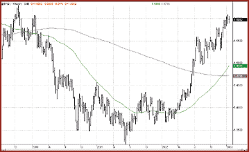 The pound is among those currencies that have appreciated significantly against the dollar in the last year and a half. In fact, the pound’s technical strength is reflected in its rise above both its 50-week and 200-week moving averages in the first half of 2002. The pound now finds itself in the middle of a price range that was commonplace throughout the 1990s.