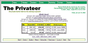 The Privateer website is divided into a number of sections; for example, a central section is The Privateer's Gold Pages. The section features a variety of essays on "Gold As Money," covering the fundamental economic role of money as well as the history of paper money. An interesting history of gold is provided in another set of essays that chronicle the changes in gold since gold ownership by Americans was prohibited (during the Great Depression) until the present day. A variety of datapoints on gold - from quotes and prices to charts and gold stocks - is also available on this page.