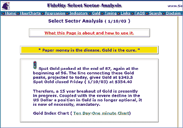 Other features available on the site include hourly charts of the different Fidelity sector funds. As you go through the site you will notice charts from some popular technical analysis sites such as BigCharts.com, StockCharts.com, and DecisionPoint.com. Regression tables, market indicators such as highs minus lows, and the summation index are also available on the site. These help in determining the direction of trends. An in-depth analysis of the strongest sector is included.