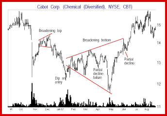 Figure 1 shows a good example of what I call a broadening bottom. If you are familiar with broadening tops (see November-December 1996), bottoms are just the same, except that prices enter the formation after a downtrend. If the general market is at a turning point (from down to up), prices should reverse course and exit at the top of the chart pattern, but there is no guarantee of that. More than half the time (58%), the pattern acts as a reversal of the prevailing price trend. Still, 58% is only a slight improvement on randomness, so be sure to wait for the breakout.