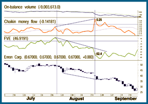 FIGURE 1: ENRON CORP. (NYSE:ENE). First window from bottom: 21-day FVE. Second window from bottom: 21-day CMF. Top window: OBV.