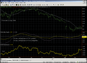 Katsanos spends much of the article discussing divergence between price and Fve trends. He defines these trends in terms of linear regression slopes. The following indicator, "FinVolEleLinRegSl," plots these two slopes (Figure 1). An input factor for the "PriceSlope" has been added to allow the user to match the oscillation range of FVE and price slopes.