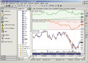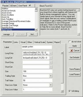FIGURE 15: NEOTICKER, BACKTESTING THE FVE. Use the Add Indicator window to open the BackTest EZ indicator. You can use this to aid in backtesting the FVE system.