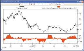 This indicator and strategy code will be available for download from the EasyLanguage Exchange at TradeStationWorld.com. Look for the file "FiniteElementVolume.eld."-- Mark Mills, MarkM@TSSecGO BACK