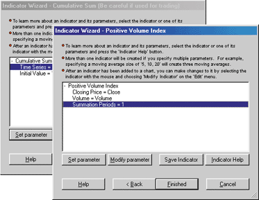 The positive volume index and negative volume index discussed by Dennis Peterson in his article this issue can be easily implemented in NeuroShell Trader by combining two of the 800+ built-in indicators. Although the NeuroShell Trader program already includes both the positive volume index and negative volume index, those are based on a predefined window size instead of accumulating. Thus, all we have to do to get the same results as Peterson did in his article is combine our predefined versions with one of our powerful accumulating indicators: