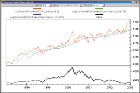 FIGURE 7: eSIGNAL, POSITIVE VOLUME INDEX. This eSignal chart displays the positive volume index (PVI).