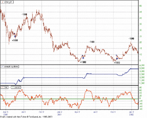 FIGURE 16: NEOTICKER, FVE SYSTEM EQUITY CURVE. You can plot an equity curve of the FVE system and use money management stops by changing the Trailing Style to "Bar" and Trail Value to 50. This will stop out the trade 50 days from the buy signal.You can use NeoTicker's built-in system performance viewer to review the orders, transactions, and summary of the trading system. To do so, right-click on the trading system equity curve, select Trading System> Open Performance Viewer from the popup menu. Click on the Trades Summary in the performance viewer to show the system summary (Figure 17). To see a listing of the transactions (Figure 18), choose the Transactions item.