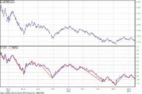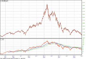 FIGURE 5: AMIBROKER, POSITIVE VOLUME INDEX. This AmiBroker screenshot shows a Nasdaq composite daily price chart (top window) and PVI annotated with a 5% zigzag line (bottom window) and replicates the chart presented in Peterson's article in this issue.LISTING 1 Plot( Zig( PVI(), 5 ), "Zig of PVI", colorBlack ); Plot( PVI(), "PVI", colorRed ); GraphXSpace=3;
