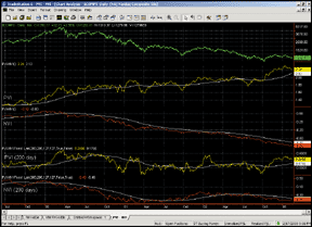 FIGURE 11: WEALTH-LAB, POSITIVE VOLUME INDEX/NEGATIVE VOLUME INDEX. This sample Wealth-Lab chart plots the PVI/NVI.{ Declare Variables } var PP, NP, Bar, PVI, NVI: integer; var PVIMA, NVIMA: integer; var RC: float; { Create PVI and NVI Indicators } PVI := CreateSeries; NVI := CreateSeries; for Bar := 1 to BarCount - 1 do begin RC := ROC( Bar, #Close, 1 ); @PVI[Bar] := @PVI[Bar - 1]; @NVI[Bar] := @NVI[Bar - 1]; if Volume( Bar ) > Volume( Bar - 1 ) then @PVI[Bar] := @PVI[Bar] + RC else @NVI[Bar] := @NVI[Bar] + RC; end; { Create Moving Averages } PVIMA := SMASeries( PVI, 255 ); NVIMA := SMASeries( NVI, 255 ); { Plot Indicators } NP := CreatePane( 100, true, true ); PlotSeries( NVI, NP, #Red, #Thick ); PlotSeries( NVIMA, NP, #Maroon, #Thin ); DrawLabel( 'NVI and 255 day MA', NP ); PP := CreatePane( 100, true, true ); PlotSeries( PVI, PP, #Green, #Thick ); PlotSeries( PVIMA, PP, 030, #Thin ); DrawLabel( 'PVI and 255 day MA', PP ); { Perform bar by bar analysis of trend } for Bar := 256 to BarCount - 1 do begin if @PVI[Bar] > @PVIMA[Bar] then begin SetPaneBackgroundColor( Bar, PP, #GreenBkg ); if Bar = BarCount - 1 then DrawLabel( 'PVI Outlook is 79% Bullish', PP ); end else begin SetPaneBackgroundColor( Bar, PP, #RedBkg ); if Bar = BarCount - 1 then DrawLabel( 'PVI Outlook is 67% Bearish', PP ); end; if @NVI[Bar] > @NVIMA[Bar] then begin SetPaneBackgroundColor( Bar, NP, #GreenBkg ); if Bar = BarCount - 1 then DrawLabel( 'NVI Outlook is 96% Bullish', NP ); end else begin SetPaneBackgroundColor( Bar, NP, #RedBkg ); if Bar = BarCount - 1 then DrawLabel( 'NVI Outlook is 50% Bearish', NP ); end; end;--Dion Kurczek, Wealth-Lab, Inc.