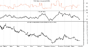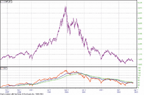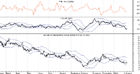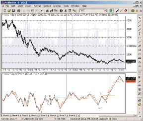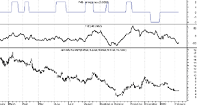FIGURE 27: METASTOCK, FINITE VOLUME ELEMENTS. Here are sample results of using the %B method to detect divergences between the FVE and price, as described in Katsanos' article this issue.Storz's Divergence method Name: FVE - Storz's divergence Formula: pds:=Input("period for FVE",10,80,22); z:=Input("zig zag percent",1,80,5); r:=Input("bars used to normalize data",10,500,125); mf:=C-(H+L)/2+Typical()-Ref(Typical(),-1); fve:=Sum(If(mf>0.3*C/100,+V, If(mf<-0.3*C/100, -V,0)),pds)/Mov(V,pds,S)/pds*100; dfve:=(Peak(1,fve,z)-Peak(2,fve,z))/ (HHV(fve,r)-LLV(fve,r)); dc:=(Peak(1,C,z)-Peak(2,C,z))/ (HHV(C,r)-LLV(C,r)); dfve-dc