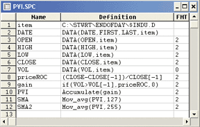 In SmarTrader, we first added a formula to calculate the price rate of change, priceRoc, in row 8. (The SmarTrader specsheet is shown in Figure 24.) In row 9, Gain, we added an "if" statement to test for day-to-day increasing volume. When volume is increasing, gain will return the value of priceRoc. When volume is not increasing, gain will be zero.