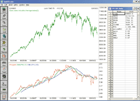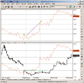 FIGURE 3: AMIBROKER, FINITE VOLUME ELEMENTS. This AmiBroker chart shows a daily chart of Manugistics Group and replicates the chart presented in Katsanos' article in this issue. The bottom window shows price and FVE. The top window shows a 22-day FVE.