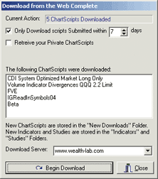 FIGURE 9: WEALTH-LAB, DOWNLOAD INDICATORS. Download new studies, indicators, and systems automatically through the "Community/Download ChartScripts" selection from the main menu. After installing Fve, you can plot it and use it in trading system rules.
