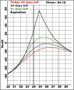 The higher the volatility of the short-term options, the higher the potential profit of the trade. Look for the curve that shows the greatest reward-to-risk ratio for your 40 cents, as well as the widest range in which the stock can trade and still allow the position to remain profitable.