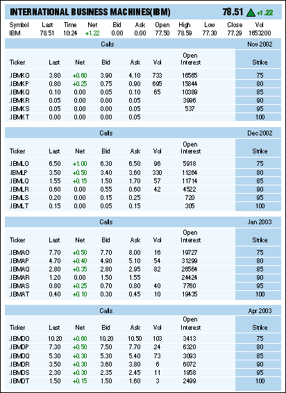 FIGURE 1: OPTION QUOTES FOR IBM. A quick upward move will result in a rise of every strike to the price of the next highest strike.