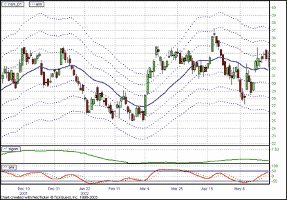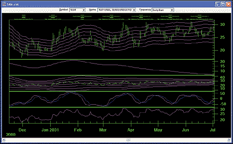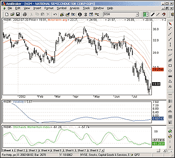FIGURE 1: AMIBROKER, TIME AND MONEY CHART. This AmiBroker chart shows a daily time and money (TAM) chart of National Semiconductor (NSM) and replicates the chart presented in Stuart Belknap's article this issue. The bottom windows show a volatility indicator and the stochastic momentum indicator.