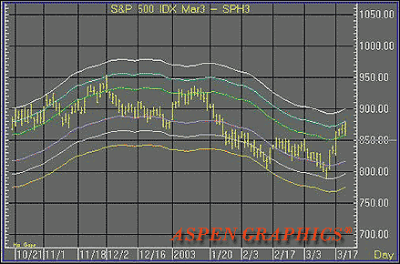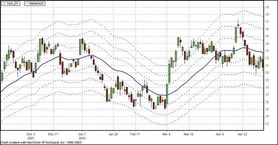 These formulas can be overlaid onto the chart and by using the Parameters menu, the user can adjust the "band" so that multiple lines can be drawn from a single formula (Figure 12).TamChannelUpper(input,Del=5,Band=1,Periods=25)=(1+(Band*del/100))*savg($1.close,Periods) TamChannelLower(input,Del=5,Band=1,Periods=25)=(1-(Band*del/100))*savg($1.close,Periods)FIGURE 12: ASPEN GRAPHICS, TIME AND MONEY CHART, upper and lower channels. The upper and lower channels can be overlaid on the time and money chart. By using the parameters menu, you can adjust the "band" so that multiple lines can be drawn from a single formula.