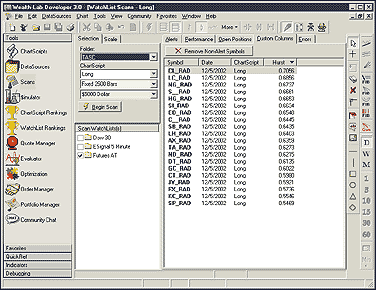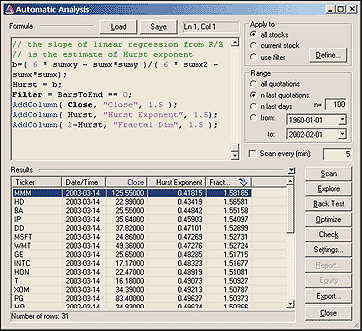 Listing 1 shows the exploration code that calculates both the Hurst exponent and the fractal dimension estimates for all symbols in the database. Sample output is shown in Figure 2. To use this code, simply copy it to the Automatic Analysis formula field and press the "Explore" button.
