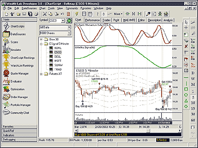 FIGURE 3: WEALTH-LAB, TIME AND MONEY CHARTS. This sample Wealth-Lab chart displays a TAM chart of Cisco five-minute bars with a simple trading system applied. The system goes long when prices touch the lower band and exits the position when prices reach the "norm" (moving average). The chart also displays the volatility sigma (%) and the stochastic momentum index indicator as described in Belknap's article.Our chart also displays the volatility sigma (%) and the stochastic momentum index indicator as described in the article.