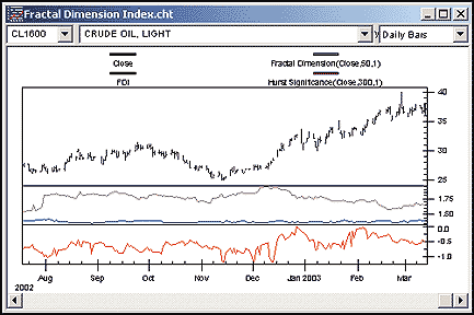 In his article "Making Sense Of Fractals," Erik Long uses the Hurst exponent as a basis for his fractal dimension index (FDI) indicator. The Hurst exponent measures the smoothness of a fractal time series based on the asymptotic behavior of its rescaled range. A value of 0.50 indicates that the time series behaves very closely to a random walk. Values higher than 0.50 indicate that the price series covers more distance than a random walk, and values less than 0.50 indicate less distance.