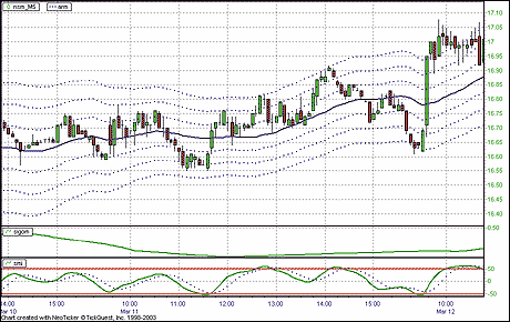 FIGURE 9: NEOTICKER,FIVE-MINUTE TIME AND MONEY CHART. For intraday TAM charts, change the days to load to "5" and change the bar type to "minute" and size to "5" to make the chart into a five-minute chart.Use the price channels lines indicator to create the candlestick chart that demonstrates price action using the moving average and its offset channels (Figure 10), as described in Long's article.