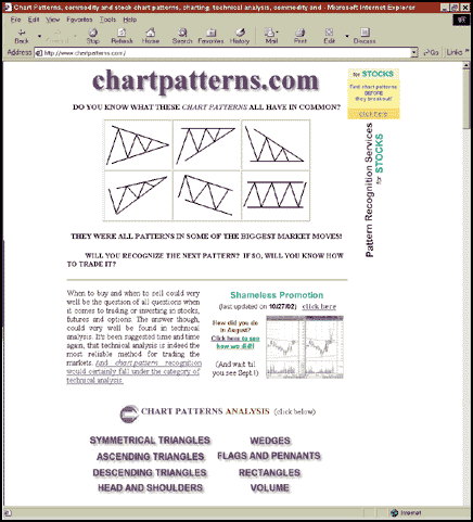 You get the descriptions and examples for free, but there are various paid services promoted on the site. For $110 per month, $285 for three months, $480 for six months, or $780 for 12 months, you can get stock recommendations through the pattern-recognition weekly newsletter. The newsletter contains an average of 25 stock charts, each displaying clearly defined patterns. With each chart comes a recommendation on when to buy or sell - for example: "Symmetrical triangle preceded by 'pole-like' moveÉ buy on upside breakout on increased volume."