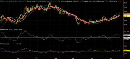 FIGURE 5: AMIBROKER, REGULARIZED MOMENTUM INDICATOR. This AmiBroker screenshot shows regularized momentum (0.05, 1.8) in green and standard MACD (12, 26) in red. Both give similar signals, but regularized momentum often provides an earlier signal.