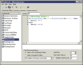 FIGURE 11: Wealth-Lab, THRUST OSCILLATOR SETTINGS. This shows the Index-Lab settings for AI (advancing issues).{ Advancing Issues } if PriceClose( Bar ) > PriceClose( Bar - 1 ) then Result := 1 else Result := 0; { Declining Issues } if PriceClose( Bar ) < PriceClose( Bar - 1 ) then Result := 1 else Result := 0; { Advancing Volume } if PriceClose( Bar ) > PriceClose( Bar - 1 ) then Result := Volume( Bar ) else Result := 0; { Declining Volume } if PriceClose( Bar ) < PriceClose( Bar - 1 ) then Result := Volume( Bar ) else Result := 0;