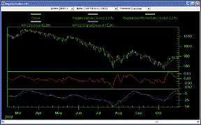 FIGURE 14: NEUROSHELL TRADER, REGULARIZATION. This sample NeuroShell Trader chart displays the regularization, regularized momentum, MACD, and MACD signal indicators.You have the option of combining these indicators with any of our 800+ built-in indicators into a chart, prediction, or trading strategy. In addition, if you decide to use these indicators in a prediction or a trading strategy, the coefficients may be optimized by the Genetic Algorithm built into NeuroShell Trader Professional and DayTrader Professional. This process will produce custom versions of the regularization indicators that best fit your data.Users of NeuroShell Trader can go to the STOCKS & COMMODITIES section of the NeuroShell Trader free technical support website to download a copy of any Traders' Tips.