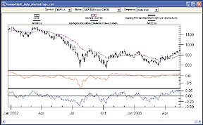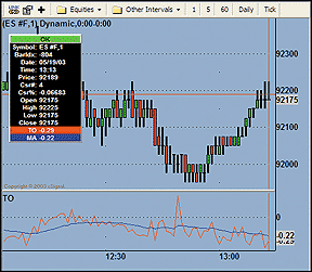 FIGURE 8: eSIGNAL, THRUST OSCILLATOR. This eSignal chart demonstrates the thrust oscillator./********************************************************************** Description : This Indicator plots the THRUST OSCILLATOR Provided By : TS Support, LLC for eSignal (c) Copyright 2003 **********************************************************************/ function preMain() { setStudyTitle("TO"); setCursorLabelName("TO",0); setCursorLabelName("MA",1); setDefaultBarFgColor(Color.red,0); setDefaultBarFgColor(Color.blue,1); } var EMA_1 = 0.0; function main(Length) { if (Length == null) Length = 22; var K = 2 / (Length + 1); var TO = 0; var EMA = 0; if( getValue("close","$ADV") * getValue("volume","$ADV") + getValue("close","$DECL") * getValue("volume","$DECL") != 0) TO = (getValue("close","$ADV") * getValue("volume","$ADV") - getValue("close","$DECL") * getValue("volume","$DECL")) / (getValue("close","$ADV") * getValue("volume","$ADV") + getValue("close","$DECL") * getValue("volume","$DECL")); EMA = K * TO + (1 - K) * EMA_1; if (getBarState() == BARSTATE_NEWBAR) EMA_1 = EMA; return new Array(TO,EMA); }