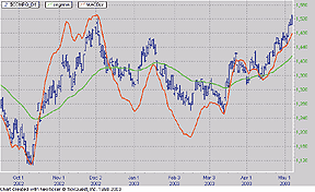 where CI represents the thrust custom indicator that was created above, and MA is set up as a 22-period exponential smoothing (the "price" of MA is not relevant in this case, as CI will be substituted as the price). This smoothed thrust oscillator custom indicator is charted as a histogram in the bottom pane of Figure 20. Notice from the trendlines that are drawn in the top and bottom panes that the Nasdaq composite prices and the smoothed thrust oscillator have diverged over the recent period (5/06/03 to 5/15/03). While the Nasdaq highs rose by 21.16, the thrust oscillator dropped 0.06 over the same period. According to the Hawkins article, this would indicate a bearish diversion.For more on creating custom indicators in Investor/RT, see https://www.linnsoft.com/tour/customIndicator.htm. For more on creating the price bands indicator, see https://www.linnsoft.com/tour/techind/bands.htm.
